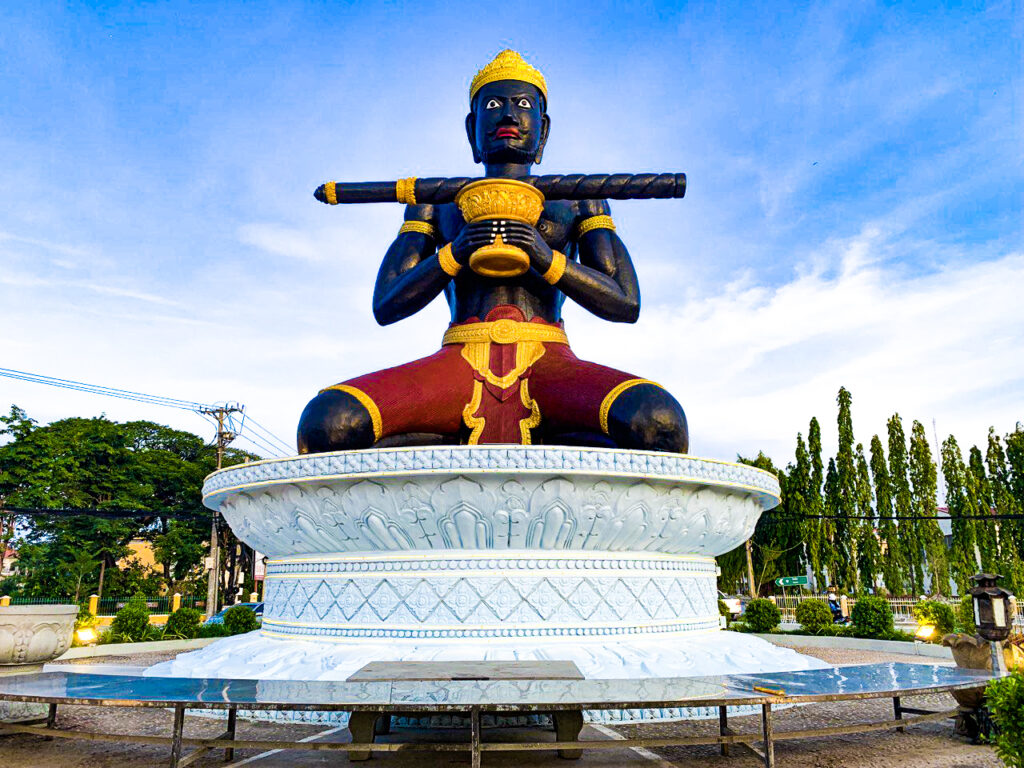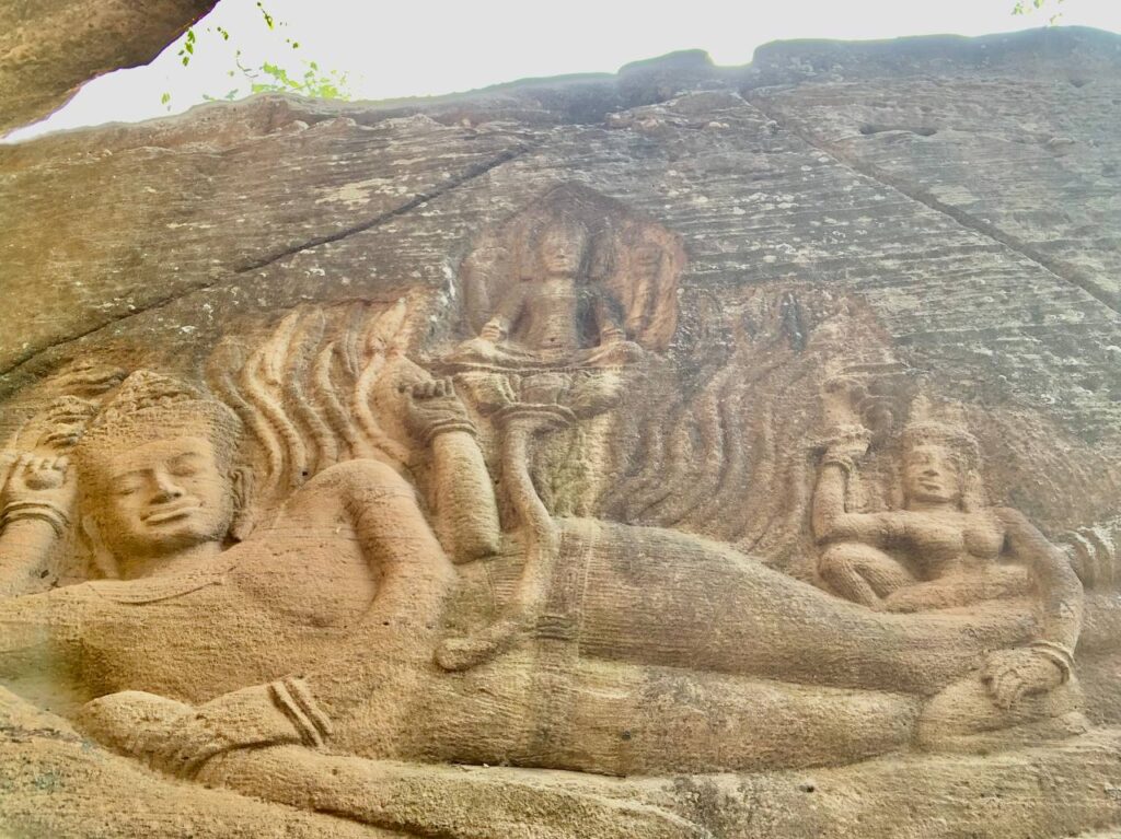 プーンコムヌーは11世紀にアンコール王朝摂政役の王師ソムシヴァ神によって作られたヒンドゥー教の場所です。 この彫刻像はアーナンダ(ヘビ)横たわるヴィシュヌ神です。そのへそからバスの花が生え、花の中ではブラフマー神が瞑想しています。もしバスの花が咲くと、ブラフマー神が世界を作ります。横たわっているヴィシュヌ神は世界を作るのを待っていると言う伝説です。 詳しくはこちらへ