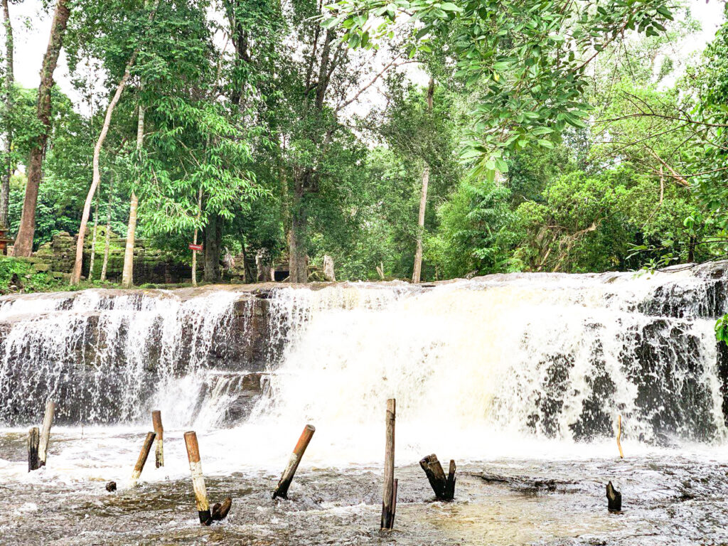 プノンクレン山の滝は二段あります。最初の滝の近くの川底にヴィシュヌ神とブラフマー神の彫像があり、その一帯は王様の沐浴場でありました。その先に小滝があり、一段下の平坦な水場は身分の高い人専用、その先に20mの落差の大滝があり、滝つぼの浅瀬は兵士の水浴び場だったと言う現在では涼をとる 詳しくはこちらへ